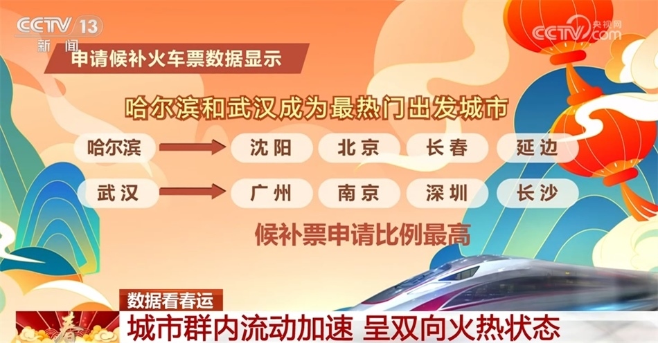 從申請候補火車票的熱門城市看,哈爾濱和武漢延續(xù)昨天的熱度,繼續(xù)成為今天候補票里最熱門的出發(fā)城市,從哈爾濱到沈陽、北京、長春、延邊,從武漢到廣州、南京、深圳、長沙的候補票的申請比例最高。提醒有候補票需求的旅客,合理安排出行。