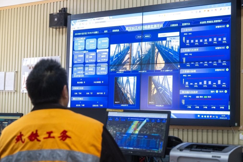 進(jìn)入高鐵時代,隨著技術(shù)的發(fā)展與進(jìn)步,大橋養(yǎng)修標(biāo)準(zhǔn)提升,養(yǎng)護(hù)水平不斷提高。在武漢長江大橋橋梁車間辦公樓一樓的主控室,大屏上顯示著大橋數(shù)十處關(guān)鍵處所監(jiān)控畫面,大橋上橋梁防撞監(jiān)控系統(tǒng)和橋梁健康監(jiān)測系統(tǒng)的各項數(shù)據(jù)實(shí)時更新。