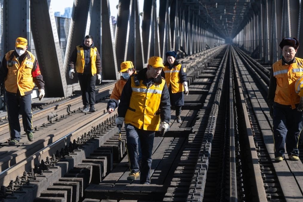 農(nóng)歷大年初三,湖北武漢陽光明媚?!叭f里長江第一橋”——武漢長江大橋宛若一條巨龍飛架于江水之上,氣勢恢宏。身穿工作服的陳卿明和同事,低頭、彎腰,循著大橋鐵道仔細(xì)地檢視鋼梁、枕木。