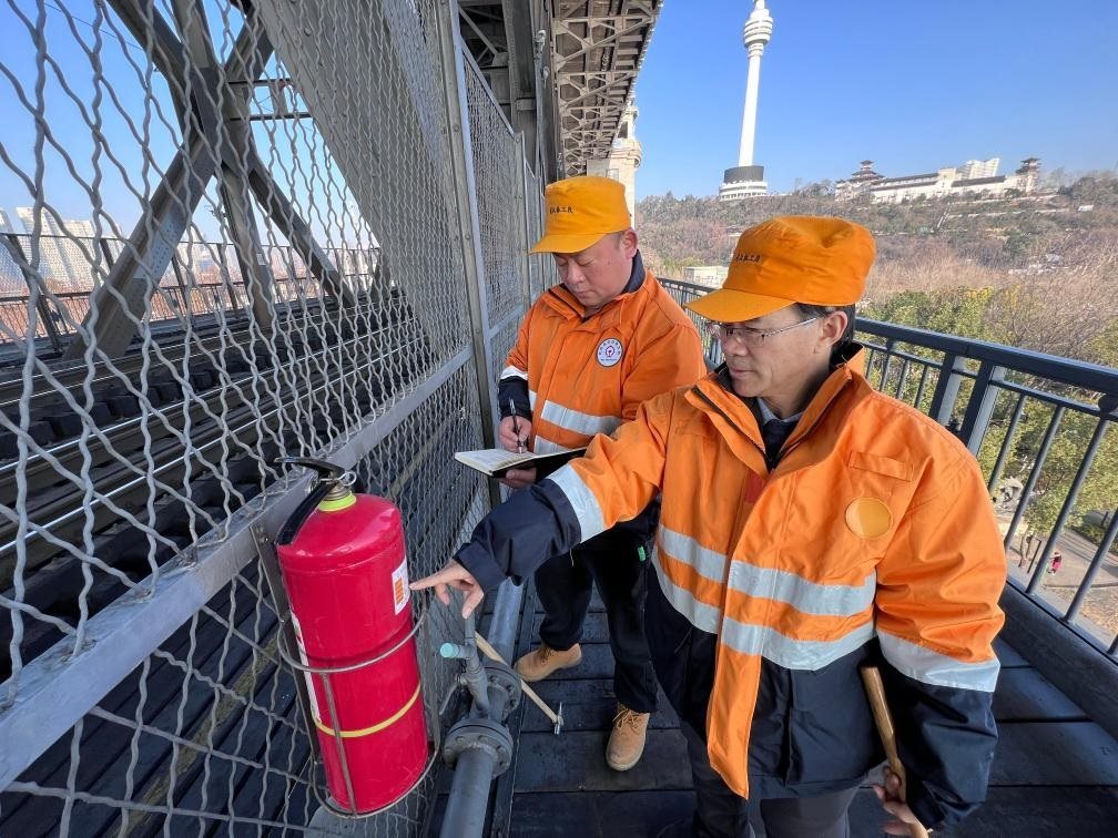 2月12日,武漢長江大橋橋梁車間員工陳卿明(左)、趙福武在武漢長江大橋上巡檢。(朱叢蓓 攝)