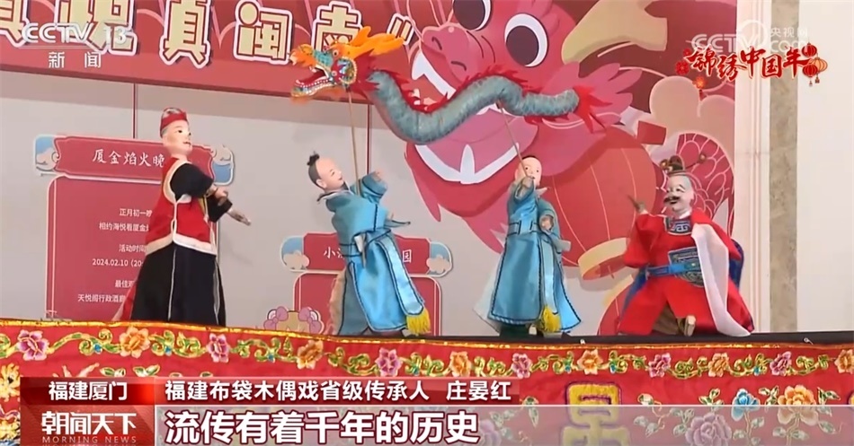 同樣在春節(jié)期間受到游客喜愛的還有廈門的非遺項目布袋木偶。莊晏紅是布袋木偶戲演出團隊的一員,她告訴我們,春節(jié)期間,團隊會有20多場的演出,忙得熱火朝天,在景區(qū)、酒店、藝術(shù)館為游客展示非遺魅力。