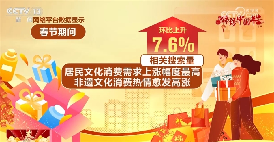網(wǎng)絡(luò)平臺數(shù)據(jù)顯示,春節(jié)期間,居民文化消費需求上漲幅度最高,非遺文化消費熱情愈發(fā)高漲,相關(guān)搜索量環(huán)比上升7.6%。其中,非遺廟會、燈會最受游客歡迎。