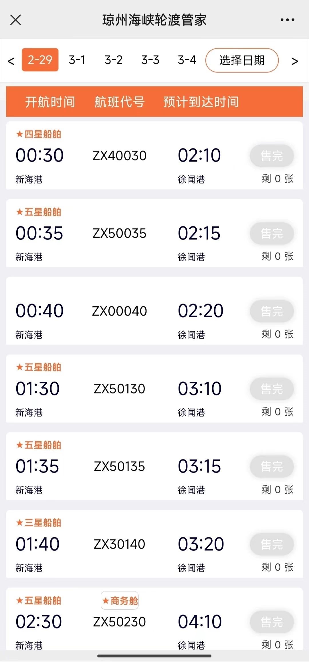 澎湃新聞?dòng)浾?7日上午查詢官方購(gòu)票平臺(tái)“瓊州海峽輪渡管家”發(fā)現(xiàn),實(shí)時(shí)數(shù)據(jù)顯示,??谛潞8壑列炻劯鄣男履茉窜囕喍善?,2月17日至2月29日均已售罄。