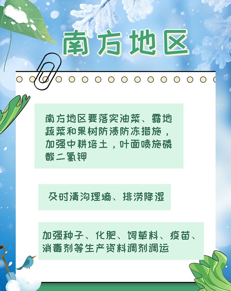 南方地區(qū)要落實油菜、露地蔬菜和果樹防漬防凍措施,加強(qiáng)中耕培土,葉面噴施磷酸二氫鉀;及時清溝理墑、排澇降濕。加強(qiáng)種子、化肥、飼草料、疫苗、消毒劑等生產(chǎn)資料調(diào)劑調(diào)運(yùn)。