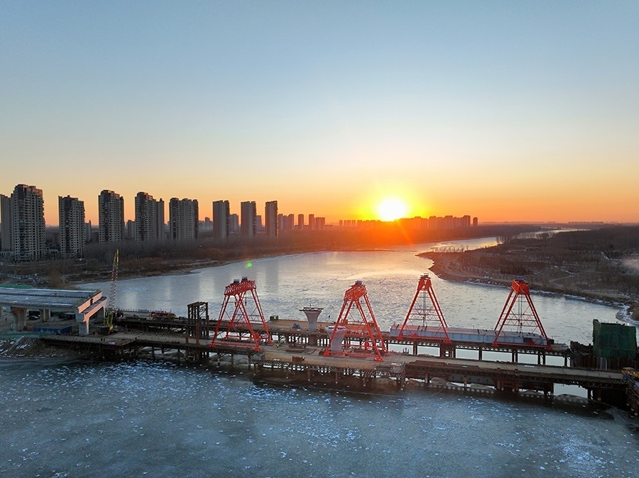 1月15日拍攝的建設中的廠通路潮白河大橋(無人機照片)。新華社記者 邢廣利 攝