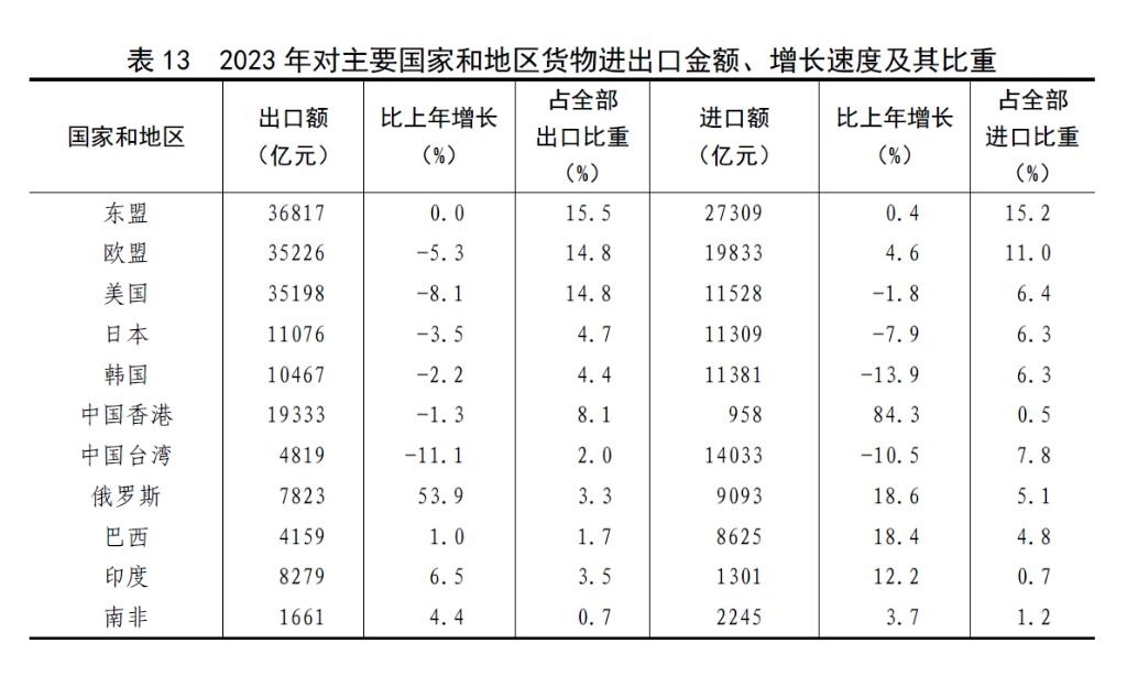全年貨物進出口總額417568億元,比上年增長0.2%。其中,出口237726億元,增長0.6%;進口179842億元,下降0.3%。貨物進出口順差57883億元,比上年增加1938億元。對共建“一帶一路”[46]國家進出口額194719億元,比上年增長2.8%。其中,出口107314億元,增長6.9%;進口87405億元,下降1.9%。對《區(qū)域全面經(jīng)濟伙伴關(guān)系協(xié)定》(RCEP)其他成員國[47]進出口額125967億元,比上年下降1.6%。民營企業(yè)進出口額223601億元,比上年增長6.3%,占進出口總額比重為53.5%。