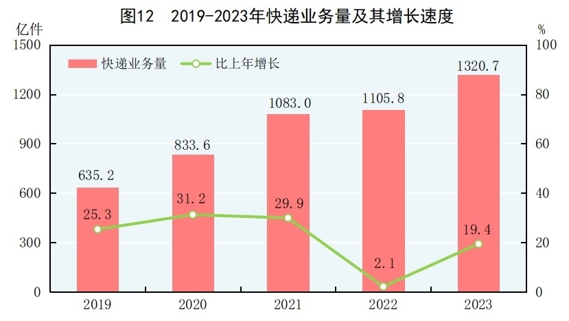 全年完成郵政行業(yè)寄遞業(yè)務(wù)總量[29]1625億件,比上年增長16.8%。郵政業(yè)完成郵政函件業(yè)務(wù)9.7億件,包裹業(yè)務(wù)0.2億件,快遞業(yè)務(wù)量1320.7億件,快遞業(yè)務(wù)收入12074億元。全年完成電信業(yè)務(wù)總量[30]18327億元,比上年增長16.8%。年末移動電話基站數(shù)[31]1162萬個,其中4G基站629萬個,5G基站338萬個。全國電話用戶總數(shù)189992萬戶,其中移動電話用戶172660萬戶。移動電話普及率為122.5部/百人。固定互聯(lián)網(wǎng)寬帶接入用戶[32]63631萬戶,比上年末增加4666萬戶,其中100M速率及以上的寬帶接入用戶[33]60136萬戶,增加4756萬戶。蜂窩物聯(lián)網(wǎng)終端用戶[34]23.32億戶,增加4.88億戶?;ヂ?lián)網(wǎng)上網(wǎng)人數(shù)10.92億人,其中手機上網(wǎng)人數(shù)10.91億人?;ヂ?lián)網(wǎng)普及率為77.5%,其中農(nóng)村地區(qū)互聯(lián)網(wǎng)普及率為66.5%。全年移動互聯(lián)網(wǎng)用戶接入流量3015億GB,比上年增長15.2%。軟件和信息技術(shù)服務(wù)業(yè)[35]完成軟件業(yè)務(wù)收入123258億元,比上年增長13.4%。