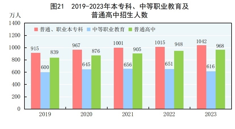 全年研究生教育招生130.2萬人,在學(xué)研究生388.3萬人,畢業(yè)生101.5萬人。普通、職業(yè)本???sup>[70]招生1042.2萬人,在校生3775.0萬人,畢業(yè)生1047.0萬人。中等職業(yè)教育[71]招生616.5萬人,在校生1737.9萬人,畢業(yè)生537.1萬人。普通高中招生967.8萬人,在校生2803.6萬人,畢業(yè)生860.4萬人。初中招生1754.6萬人,在校生5243.7萬人,畢業(yè)生1623.6萬人。普通小學(xué)招生1877.9萬人,在校生10836.0萬人,畢業(yè)生1763.5萬人。特殊教育招生15.5萬人,在校生91.2萬人,畢業(yè)生17.3萬人。學(xué)前教育在園幼兒4093.0萬人。九年義務(wù)教育鞏固率為95.7%,高中階段毛入學(xué)率為91.8%。