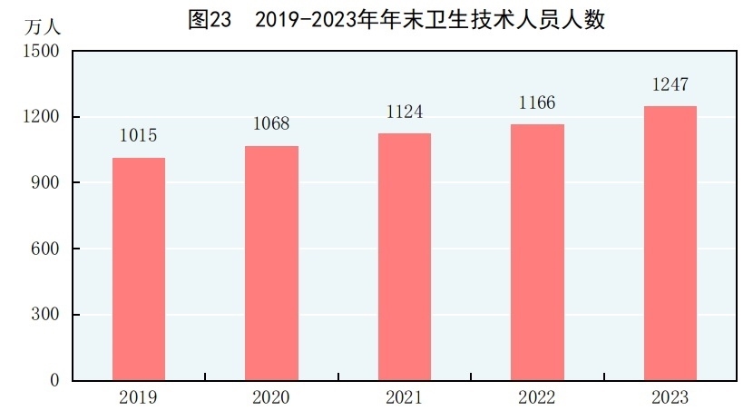 年末全國共有醫(yī)療衛(wèi)生機構(gòu)107.1萬個,其中醫(yī)院3.9萬個,在醫(yī)院中有公立醫(yī)院1.2萬個,民營醫(yī)院2.7萬個;基層醫(yī)療衛(wèi)生機構(gòu)101.6萬個,其中鄉(xiāng)鎮(zhèn)衛(wèi)生院3.4萬個,社區(qū)衛(wèi)生服務(wù)中心(站)3.7萬個,門診部(所)36.2萬個,村衛(wèi)生室58.3萬個;專業(yè)公共衛(wèi)生機構(gòu)1.2萬個,其中疾病預(yù)防控制中心3426個,衛(wèi)生監(jiān)督所(中心)2791個。衛(wèi)生技術(shù)人員1247萬人,其中執(zhí)業(yè)醫(yī)師和執(zhí)業(yè)助理醫(yī)師478萬人,注冊護士563萬人。醫(yī)療衛(wèi)生機構(gòu)床位1020萬張,其中醫(yī)院800萬張,鄉(xiāng)鎮(zhèn)衛(wèi)生院151萬張。全年總診療人次[75]95.6億人次,出院人次[76]3.0億人次。