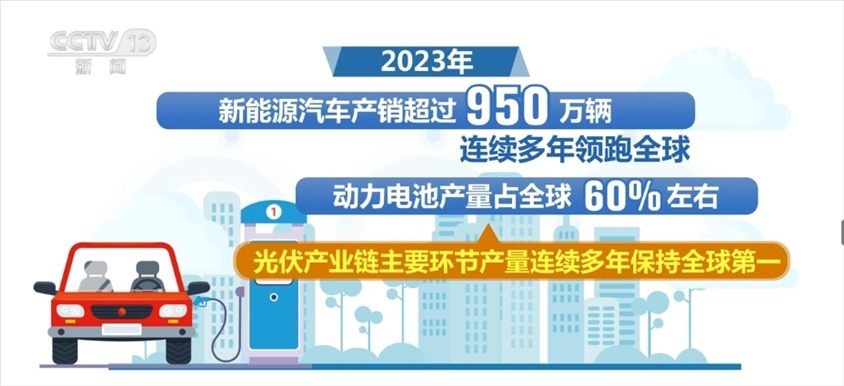 2023年,我國高技術(shù)制造業(yè)、裝備制造業(yè)增加值占規(guī)模以上工業(yè)增加值比重分別達(dá)到15.7%和33.6%。新能源汽車產(chǎn)銷超過950萬輛,連續(xù)多年領(lǐng)跑全球,動(dòng)力電池產(chǎn)量占全球60%左右,光伏產(chǎn)業(yè)鏈主要環(huán)節(jié)產(chǎn)量連續(xù)多年保持全球第一。