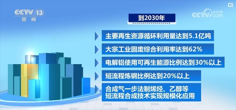 《指導(dǎo)意見》提出,到2030年,主要再生資源循環(huán)利用量達(dá)到5.1億噸,大宗工業(yè)固廢綜合利用率達(dá)到62%,電解鋁使用可再生能源比例達(dá)到30%以上,短流程煉鋼比例達(dá)到20%以上,合成氣一步法制烯烴、乙醇等短流程合成技術(shù)實(shí)現(xiàn)規(guī)?;瘧?yīng)用。