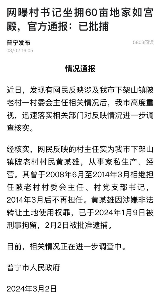 ·廣東普寧通報(bào)村支書坐擁60畝地:黃某雄因涉嫌非法轉(zhuǎn)讓土地使用權(quán)罪已被批準(zhǔn)逮捕。