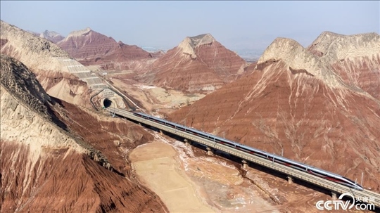 2024年3月3日,蘭州紅古區(qū)的七彩丹霞中,疾馳在蘭新高鐵上的動(dòng)車組列車從中穿越,中國(guó)速度與錦繡山河完美同框,格外壯美。