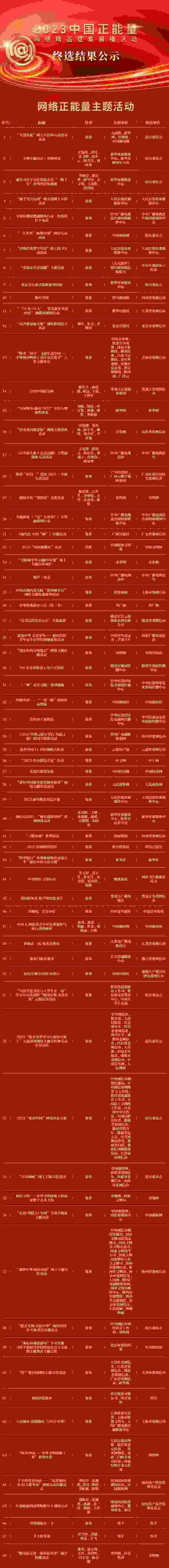 根據(jù)《2023中國正能量網(wǎng)絡(luò)精品征集展播活動規(guī)則》,現(xiàn)對擬入選作品進(jìn)行公示,公示時間為3月11日至3月15日,公示期間歡迎社會各界監(jiān)督評議,有關(guān)意見可發(fā)送至郵箱zgznl100@cac.gov.cn,公示期滿后將適時對外發(fā)布最終結(jié)果,并在線上進(jìn)行集中展播。