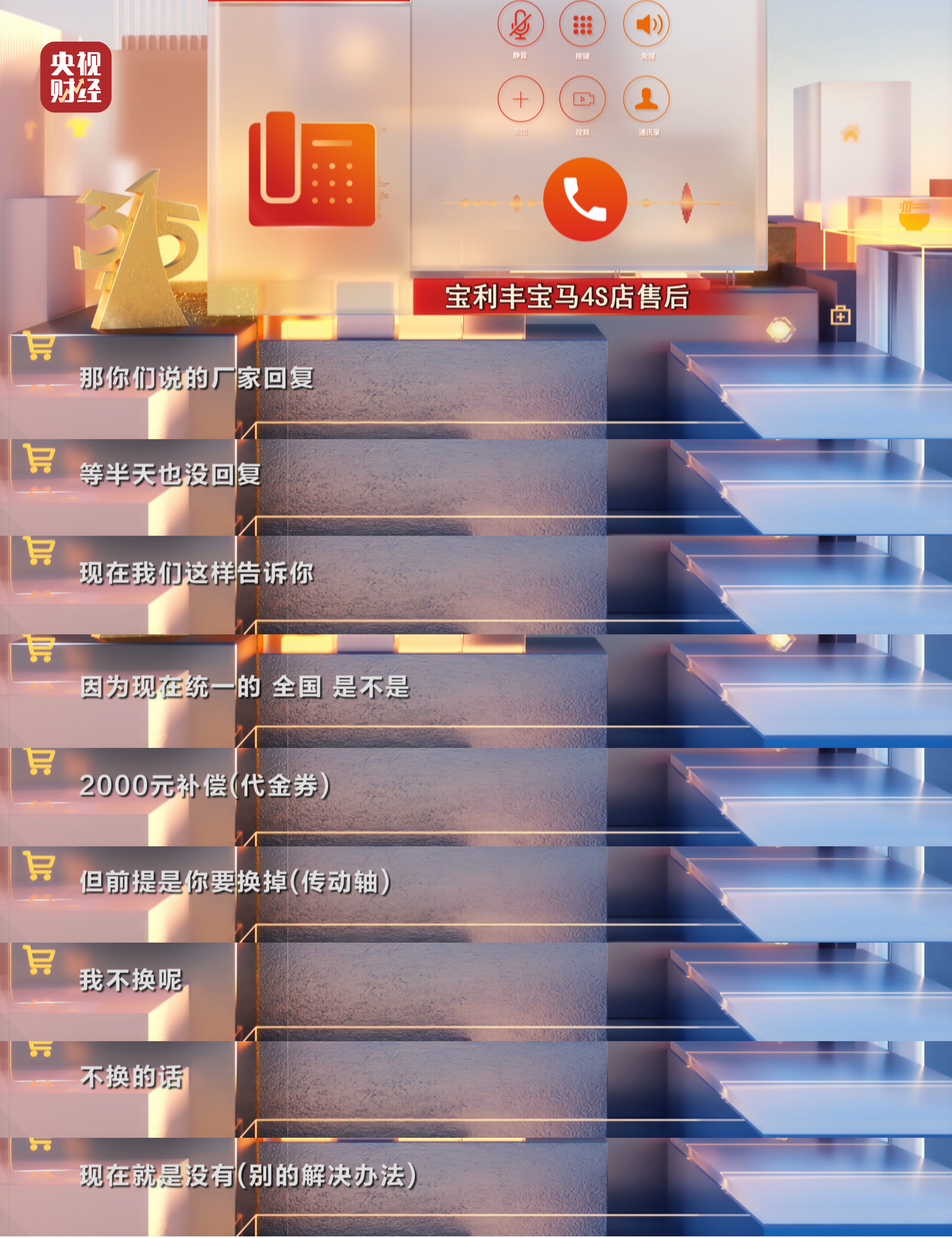 傳動(dòng)軸,是汽車動(dòng)力總成中重要部件,剛買的新車就要更換傳動(dòng)軸,等同于新車要?jiǎng)觽€(gè)“特大手術(shù)”,李先生堅(jiān)決不同意。在與4S店多次交涉無果后,無奈之下,李先生撥通了寶馬廠家的客服電話??头藛T的回答讓李先生的心涼了半截。