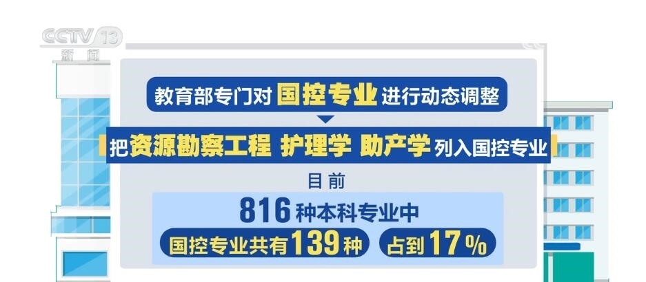 此次教育部專門對(duì)國控專業(yè)進(jìn)行了動(dòng)態(tài)調(diào)整,把資源勘察工程、護(hù)理學(xué)、助產(chǎn)學(xué)列入了國控專業(yè)。目前,816種本科專業(yè)中,國控專業(yè)共有139種,占到17%。未來,國控專業(yè)范圍還將進(jìn)行“有進(jìn)有出”的動(dòng)態(tài)調(diào)整。