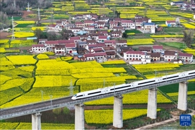 眼下,陜西漢中市百萬(wàn)畝油菜花競(jìng)相綻放,西成高鐵線(xiàn)上,一趟趟列車(chē)穿行在金黃色的油菜花海之中,為秦巴山區(qū)勾畫(huà)出朝氣蓬勃的春日景象。