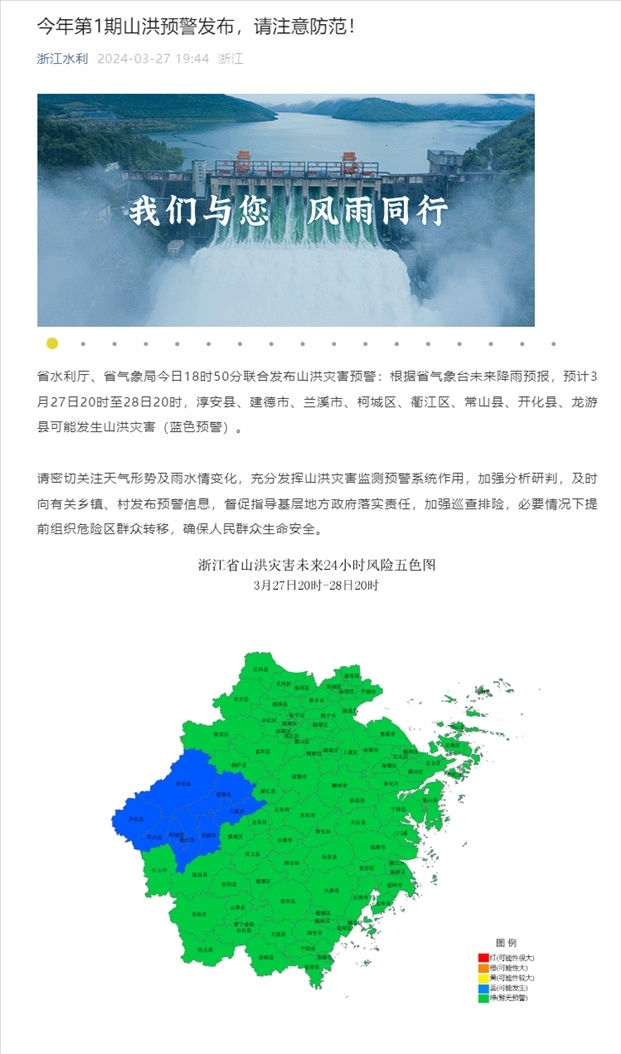 央視網(wǎng)消息:據(jù)“浙江水利”公眾號(hào)消息,浙江省水利廳、浙江省氣象局今日18時(shí)50分聯(lián)合發(fā)布山洪災(zāi)害預(yù)警:根據(jù)省氣象臺(tái)未來(lái)降雨預(yù)報(bào),預(yù)計(jì)3月27日20時(shí)至28日20時(shí),淳安縣、建德市、蘭溪市、柯城區(qū)、衢江區(qū)、常山縣、開(kāi)化縣、龍游縣可能發(fā)生山洪災(zāi)害(藍(lán)色預(yù)警)。