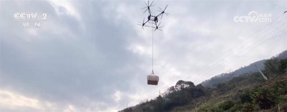 在湖北宜昌興山縣秀龍村,眼下的橙子采收也用上了新工具。裝有鉤子的無人機飛到柑橘地上空,村民用鉤子勾住裝有100斤鮮橙的筐子。隨后,無人機就將這些鮮橙運到了公路邊的貨車上。這樣的無人機一天可以運輸3萬斤橙子,完成了超過16人的工作量,節(jié)約了2500元以上的成本。