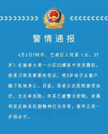 ·重慶一女子砍傷婆婆后將3歲幼子拋下樓致死,已被警方控制。鄰居稱女子高空拋子前多次高空拋物,知情人稱扔小孩母親避開了安全氣囊。
