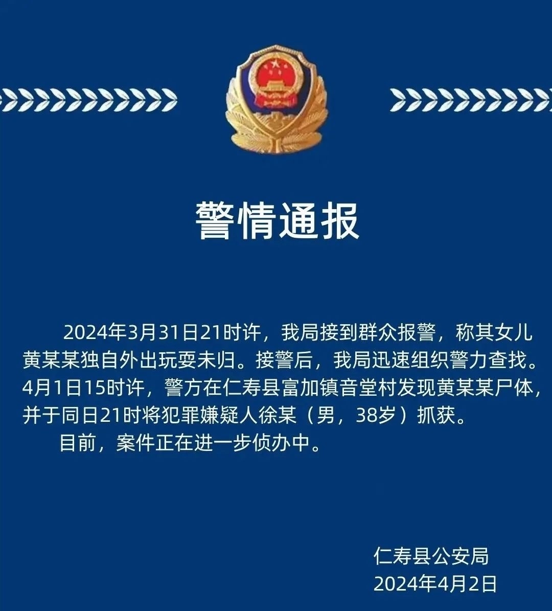 ·警方通報四川仁壽11歲女孩失蹤遇害:發(fā)現(xiàn)尸體,同日抓獲38歲嫌疑人。