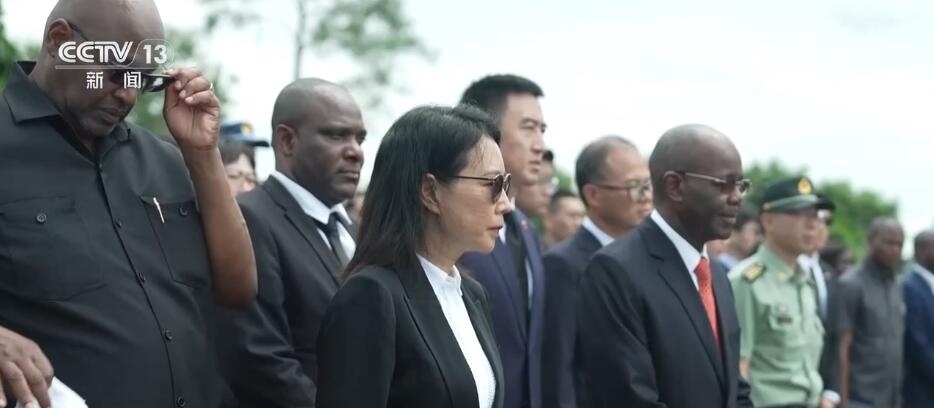 中國駐坦桑尼亞大使陳明健和坦桑尼亞工程和交通部長姆巴拉瓦走上公墓石階,整理挽聯(lián)、鞠躬致敬,全體人員默哀并三鞠躬,緬懷長眠于此的中國援建坦贊鐵路和其他援坦項(xiàng)目的專家。