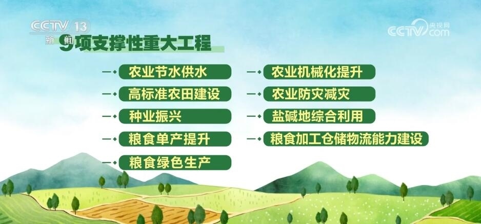 與此同時,《方案》還圍繞糧食生產的關鍵領域和薄弱環(huán)節(jié),謀劃部署了農業(yè)節(jié)水供水、高標準農田建設、種業(yè)振興、糧食單產提升、糧食綠色生產、農業(yè)機械化提升、農業(yè)防災減災、鹽堿地綜合利用、糧食加工倉儲物流能力建設等9項支撐性重大工程。