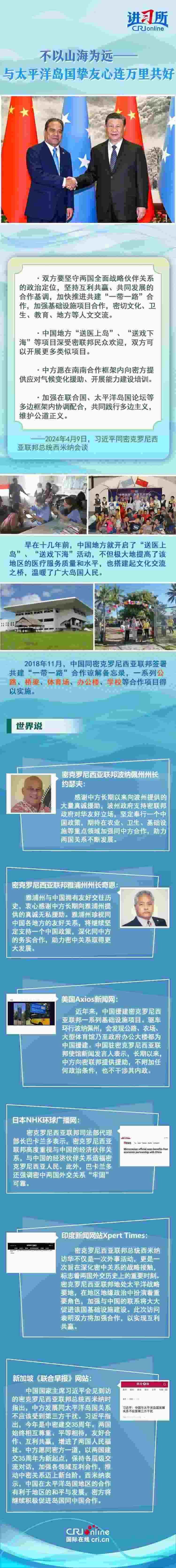 4月9日下午,中國國家主席習(xí)近平在北京同密克羅尼西亞聯(lián)邦總統(tǒng)西米納舉行會談時表示,每次見到太平洋島國的朋友,都感到很親切,中國地方“送醫(yī)上島”、“送戲下?!钡软?xiàng)目深受密聯(lián)邦民眾歡迎,中方愿繼續(xù)為島國發(fā)展提供力所能及的支持,開展三方或多方合作。