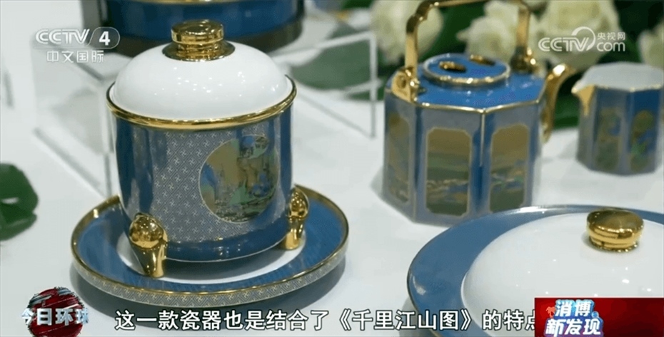江西省景德鎮(zhèn)市商務(wù)局工作人員章少聰介紹稱:“這一幅畫是北宋王希孟先生創(chuàng)作的,叫作《千里江山圖》。這一款瓷器也是結(jié)合了《千里江山圖》的特點,把中國傳統(tǒng)畫中的山水、花鳥都完全在瓷器上面展現(xiàn)出來。”