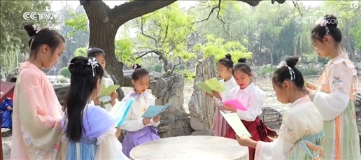 在江西南昌、河北保定,小學(xué)生們踴躍分享讀書心得。大家還走出教室,來到林蔭下、池塘邊,沉浸式誦讀經(jīng)典古詩(shī)詞。