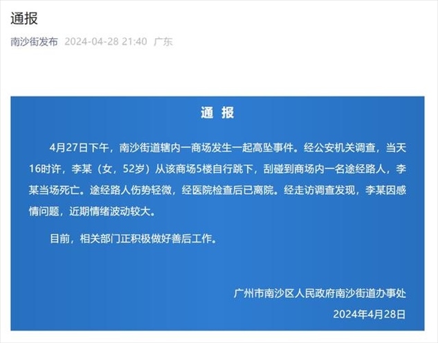 ·廣州一女子商場(chǎng)跳樓砸中路人,官方通報(bào):跳樓者當(dāng)場(chǎng)死亡,路人傷勢(shì)輕微。