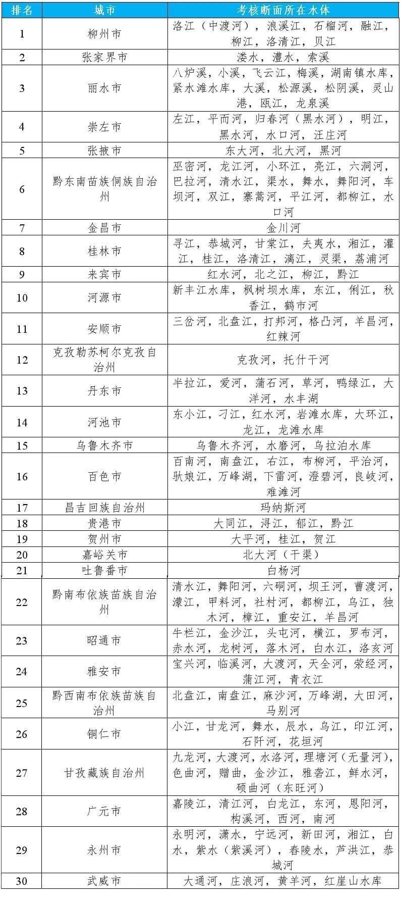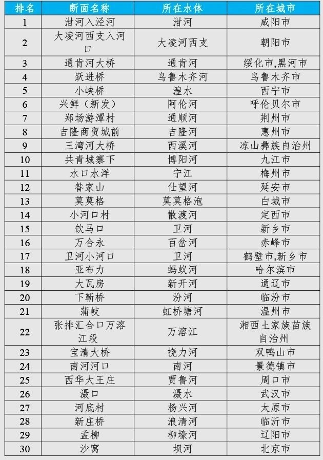咸陽市泔河入涇河、朝陽市大凌河西支入河口和綏化市/黑河市通肯河大橋等30個國家地表水考核斷面水環(huán)境質(zhì)量變化情況相對較好(從第1名至第30名),渭南市裕西、天津市新老米店閘和玉溪市化念水庫等30個國家地表水考核斷面水環(huán)境質(zhì)量變化情況相對較差(從倒數(shù)第1名至倒數(shù)第30名)。