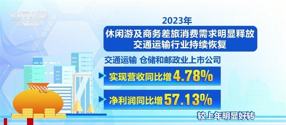 2023年,休閑游及商務(wù)差旅消費(fèi)需求明顯釋放,交通運(yùn)輸行業(yè)持續(xù)恢復(fù),交通運(yùn)輸、倉儲(chǔ)和郵政業(yè)上市公司實(shí)現(xiàn)營(yíng)收、凈利潤(rùn)同比增4.78%、57.13%,較上年明顯好轉(zhuǎn)。