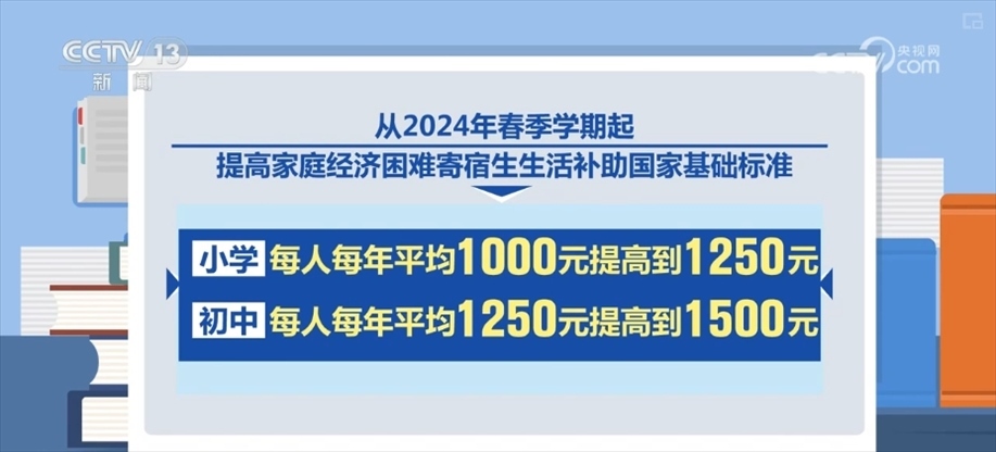 具體來看,此次下達(dá)資金用于提高家庭經(jīng)濟(jì)困難學(xué)生生活補(bǔ)助標(biāo)準(zhǔn)。從2024年春季學(xué)期起提高家庭經(jīng)濟(jì)困難寄宿生生活補(bǔ)助國家基礎(chǔ)標(biāo)準(zhǔn),小學(xué)由每人每年平均1000元提高到1250元,初中由每人每年平均1250元提高到1500元,家庭經(jīng)濟(jì)困難非寄宿生生活補(bǔ)助標(biāo)準(zhǔn)繼續(xù)按寄宿生生活補(bǔ)助國家基礎(chǔ)標(biāo)準(zhǔn)的50%核定,預(yù)計(jì)全國超過2000萬學(xué)生獲得生活補(bǔ)助。