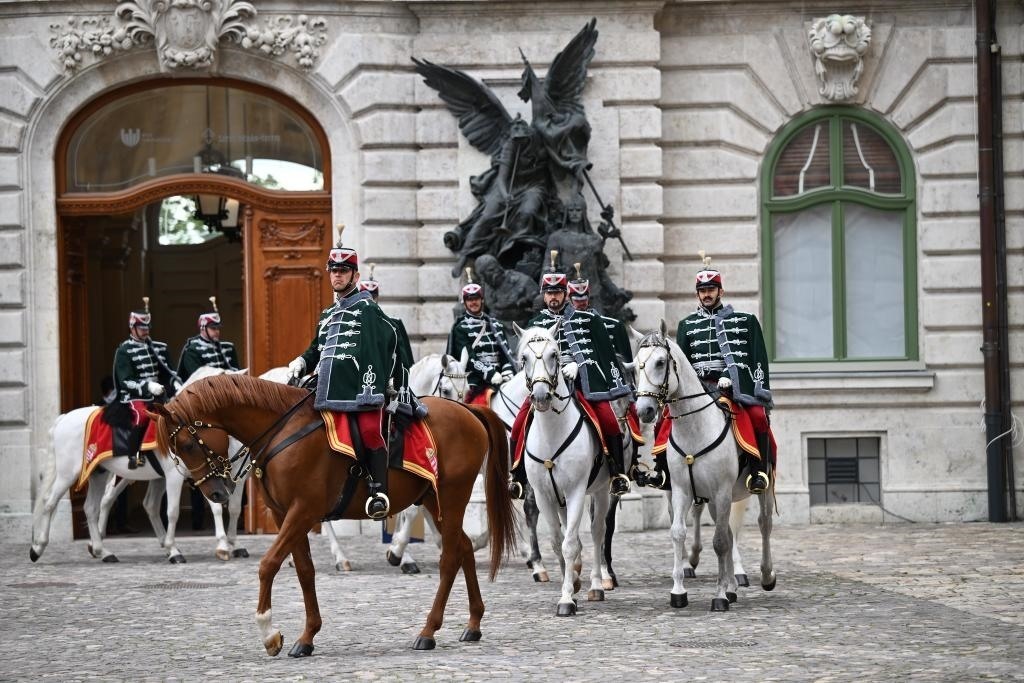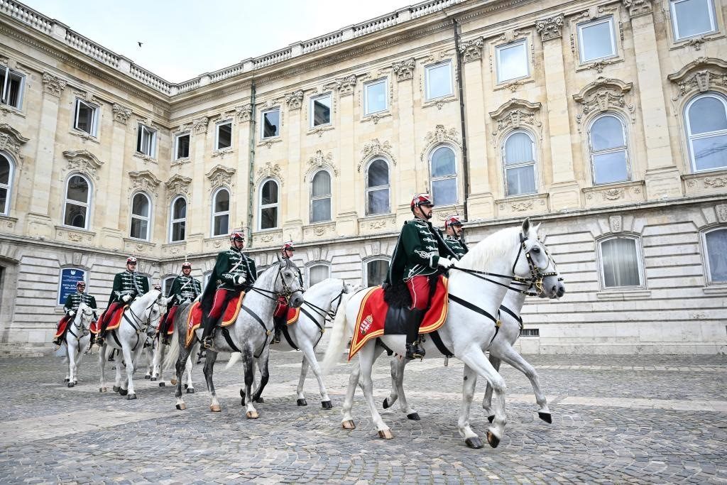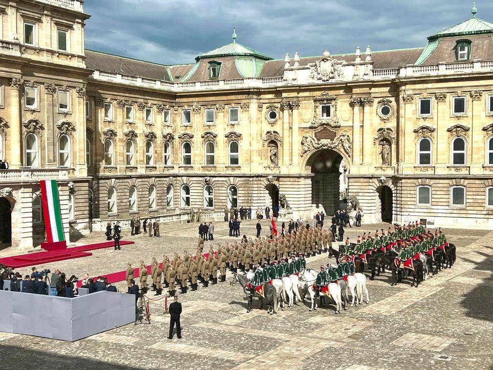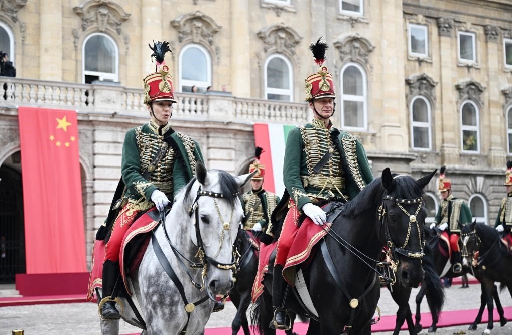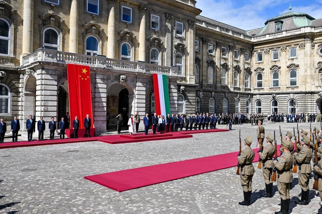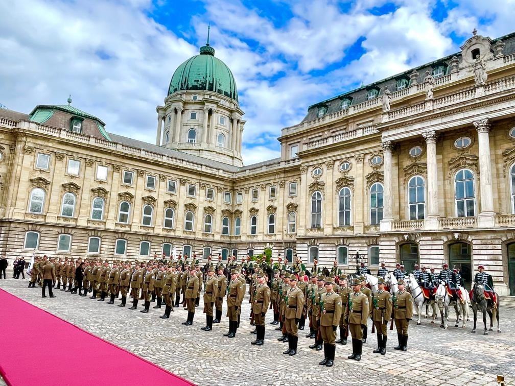 初夏時(shí)節(jié)的布達(dá)佩斯陽光明媚,古老宏偉的布達(dá)王宮莊嚴(yán)矗立,中匈兩國國旗相映成輝。習(xí)近平和夫人彭麗媛乘坐的國賓車隊(duì)在匈牙利禮賓馬隊(duì)護(hù)衛(wèi)下緩緩駛?cè)氩歼_(dá)王宮內(nèi)庭。舒尤克總統(tǒng)夫婦和歐爾班總理夫婦熱情迎接。