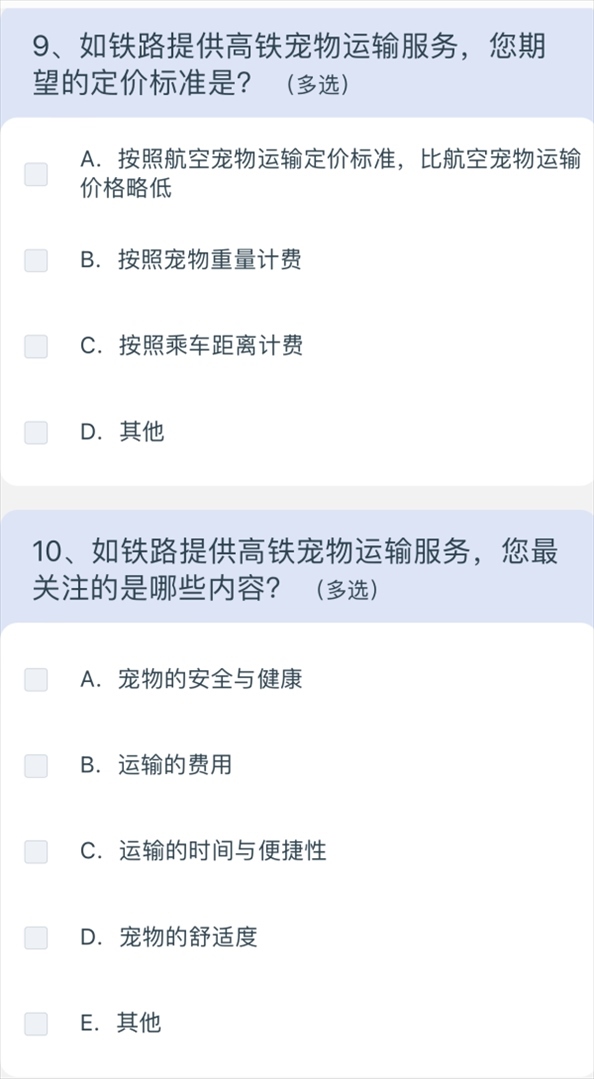 5月10日上午8點40分,澎湃新聞記者通過掃描網(wǎng)友分享的列車上的二維碼,進入12306系統(tǒng),選擇問卷·建議,進入“鐵路旅客高鐵寵物運輸”調(diào)查,共15個問題,涉及養(yǎng)寵類型、是否有攜帶寵物出行的需求、如果鐵路提供寵物運輸服務(wù)是否愿意嘗試等,以及為降低對其他旅客的影響,在高鐵寵物運輸更關(guān)注哪方面的防護;如鐵路提供高鐵寵物運輸服務(wù),期望的定價標(biāo)準(zhǔn);如鐵路提供高鐵寵物運輸服務(wù),最關(guān)注的內(nèi)容;如果是非養(yǎng)寵人士,對高鐵寵物運輸有何建議等多方面問題。