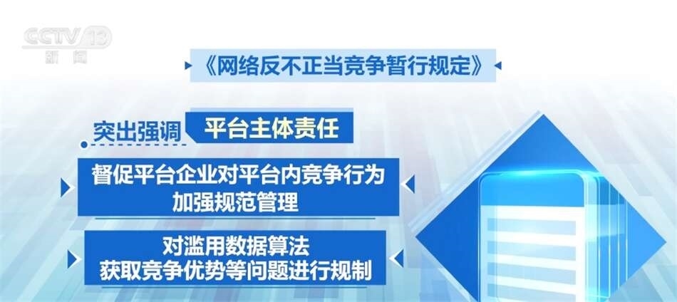 平臺企業(yè)掌握海量數(shù)據(jù),連接大量主體,既是網(wǎng)絡(luò)不正當(dāng)競爭監(jiān)管的重點對象,也是協(xié)同監(jiān)管的關(guān)鍵節(jié)點。《規(guī)定》突出強(qiáng)調(diào)了平臺主體責(zé)任,督促平臺企業(yè)對平臺內(nèi)競爭行為加強(qiáng)規(guī)范管理,同時對濫用數(shù)據(jù)算法獲取競爭優(yōu)勢等問題進(jìn)行規(guī)制。