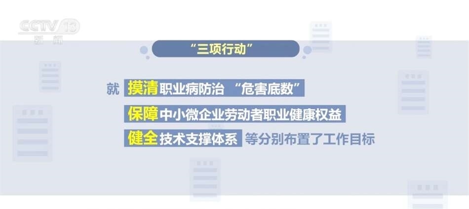 “三項行動”工作方案包括《職業(yè)病危害項目申報擴(kuò)面行動(2024—2025年)工作方案》《中小微企業(yè)職業(yè)健康幫扶行動(2024—2025年)工作方案》《職業(yè)病防治機(jī)構(gòu)提質(zhì)合規(guī)行動(2024—2025年)工作方案》。