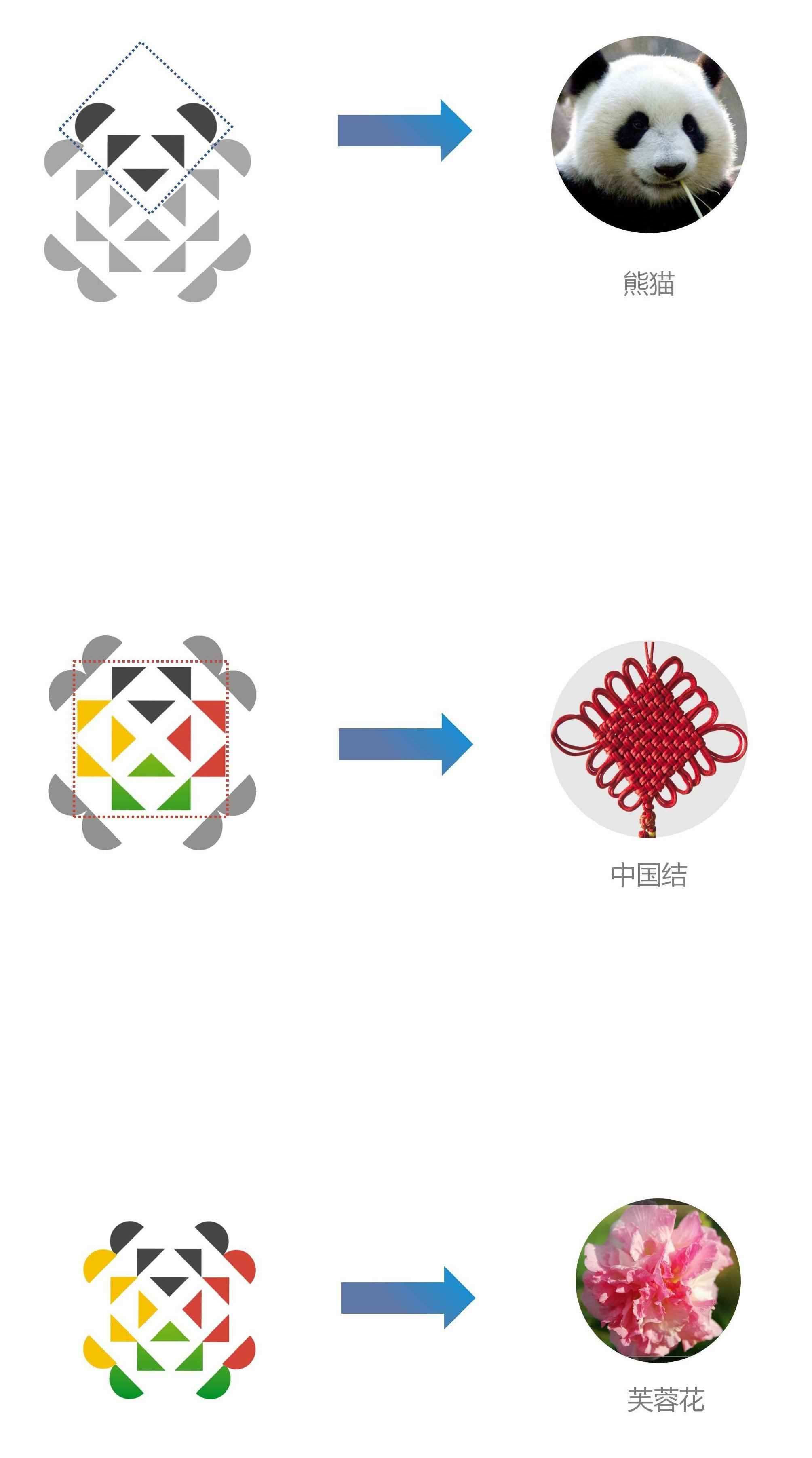 會徽設(shè)計(jì)靈感源于中國的大熊貓、芙蓉花和中國結(jié),以中國紅、金沙黃、公園綠、熊貓黑、雪山白為主色調(diào)。作為 2025 年成都世界運(yùn)動會的重要標(biāo)志,這一會徽有效傳達(dá)了奧林匹克精神又凸顯了中國傳統(tǒng)元素和成都特色,彰顯了“團(tuán)結(jié)、包容、多樣性”的價(jià)值觀。同時(shí),設(shè)計(jì)師秉承色彩明快、造型簡潔的設(shè)計(jì)理念,其外圍的半圓圖案和內(nèi)部排列的三角形,圍成一朵盛開的芙蓉花;紅、黑、黃、綠、白的幾何色塊拼出可愛的卡通大熊貓。