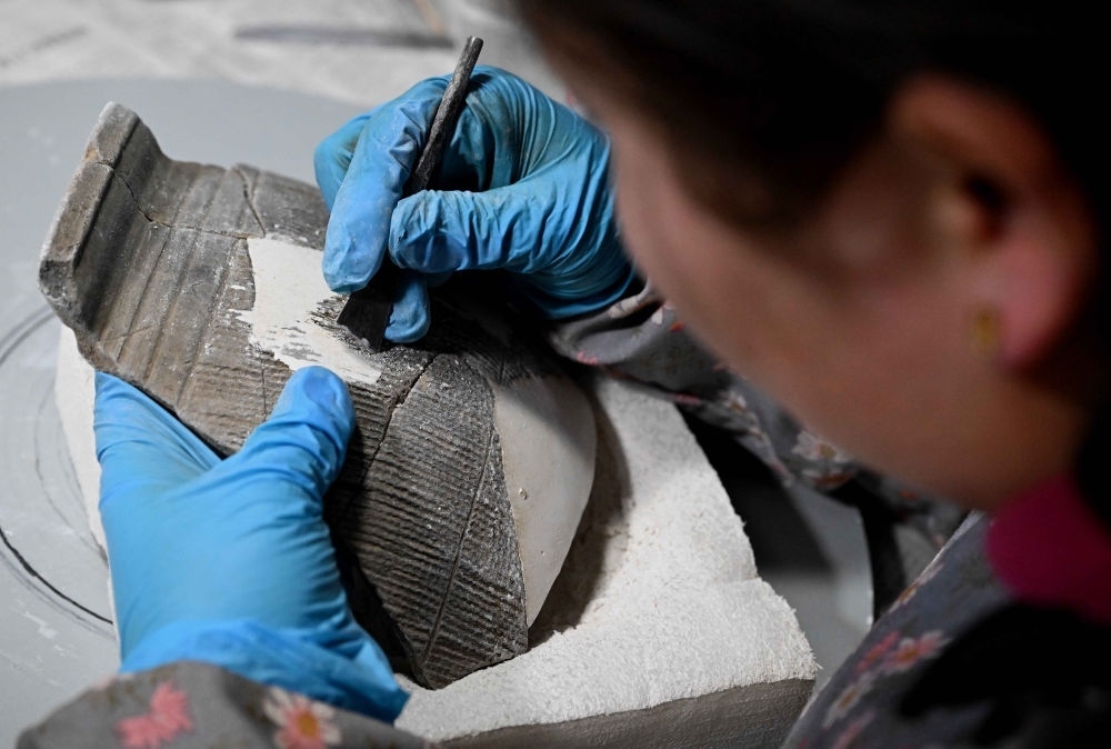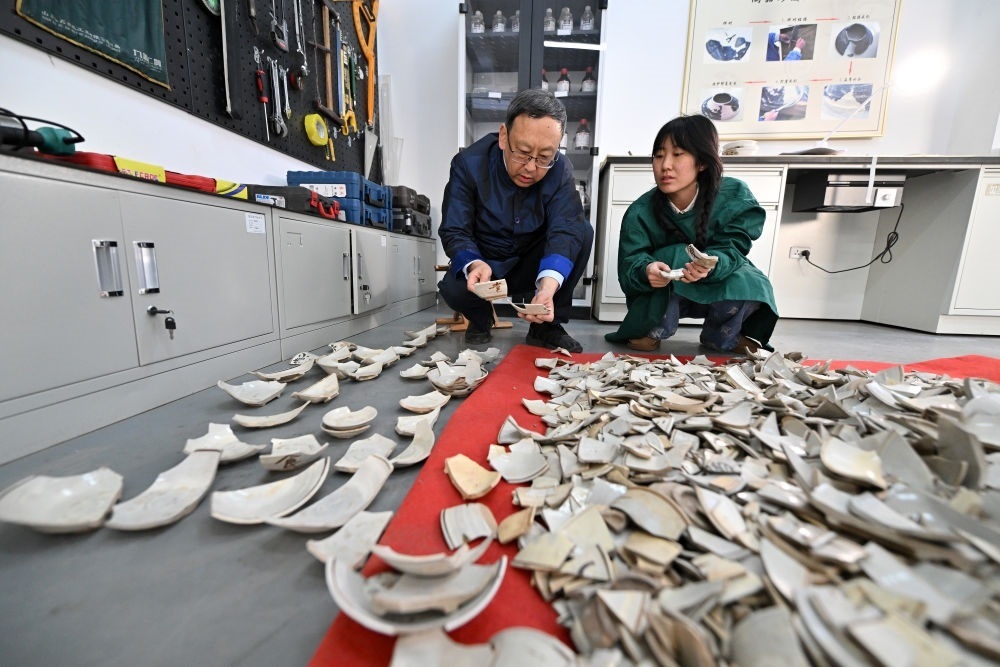 2024年2月23日,在中國社會科學院考古研究所安陽工作站,工作人員在整理修復殷墟洹北商城出土的陶片。