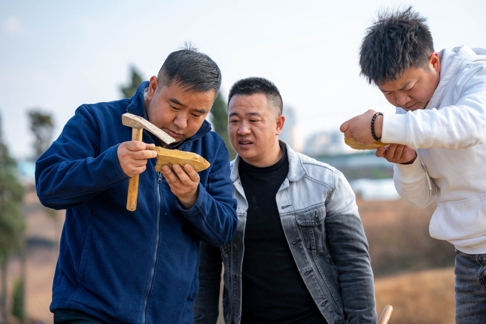 2024年2月22日,云南澄江化石地世界自然遺產(chǎn)博物館副館長郭進(左一)和同事在云南省澄江市黑蟆地查看采集到的化石標本。
