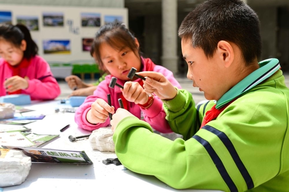 2024年4月22日,內(nèi)蒙古自治區(qū)鄂爾多斯市康巴什區(qū)實驗小學在康巴什自然博物館開展“探索自然奧秘 保護地球家園”主題研學活動,這是學生在研學課程中體驗尋找動物化石。