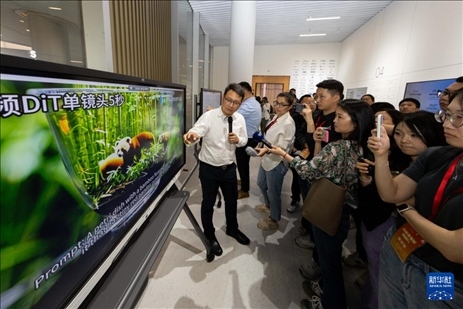 ?5月23日,大模型企業(yè)、智象未來生態(tài)合作部總經理沈偉峰為采訪團介紹運用大模型文生視頻。新華社記者 王翔 攝