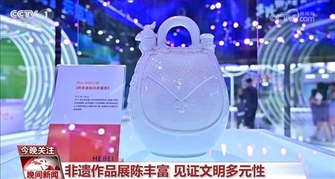 這是國家級非遺邢窯白瓷,它是根據(jù)河北衡水故城縣出土的唐代文物白釉鳳首蓋貼花皮囊壺創(chuàng)作的,呈現(xiàn)的是古代中原制瓷技藝與游牧民族文化的融合。