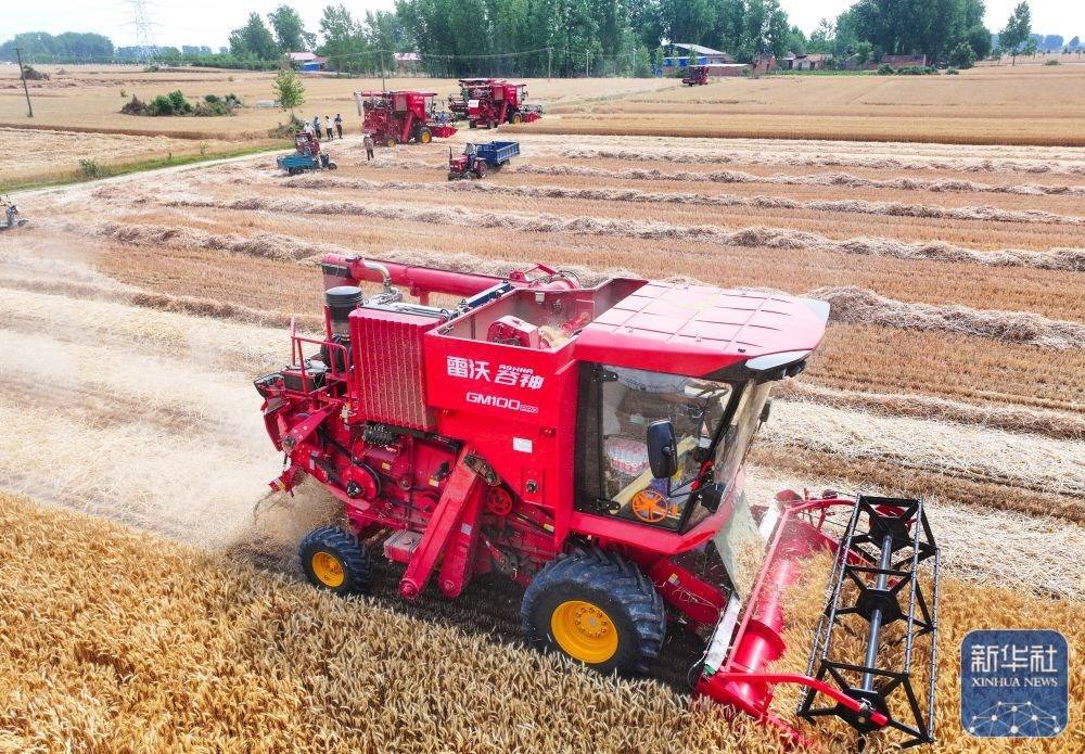 5月25日,在河南省駐馬店市汝南縣三橋鎮(zhèn)殷店村,收割機(jī)、秸稈摟草機(jī)在麥地里穿梭作業(yè)。新華社發(fā)(張萌攝)