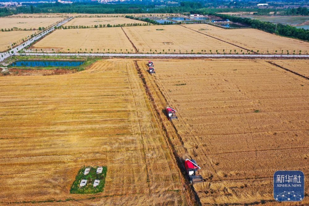5月24日,河南省駐馬店市正陽(yáng)縣王勿橋鄉(xiāng)謝莊村村民在搶收小麥(無(wú)人機(jī)照片)。新華社發(fā)(高萬(wàn)寶攝)