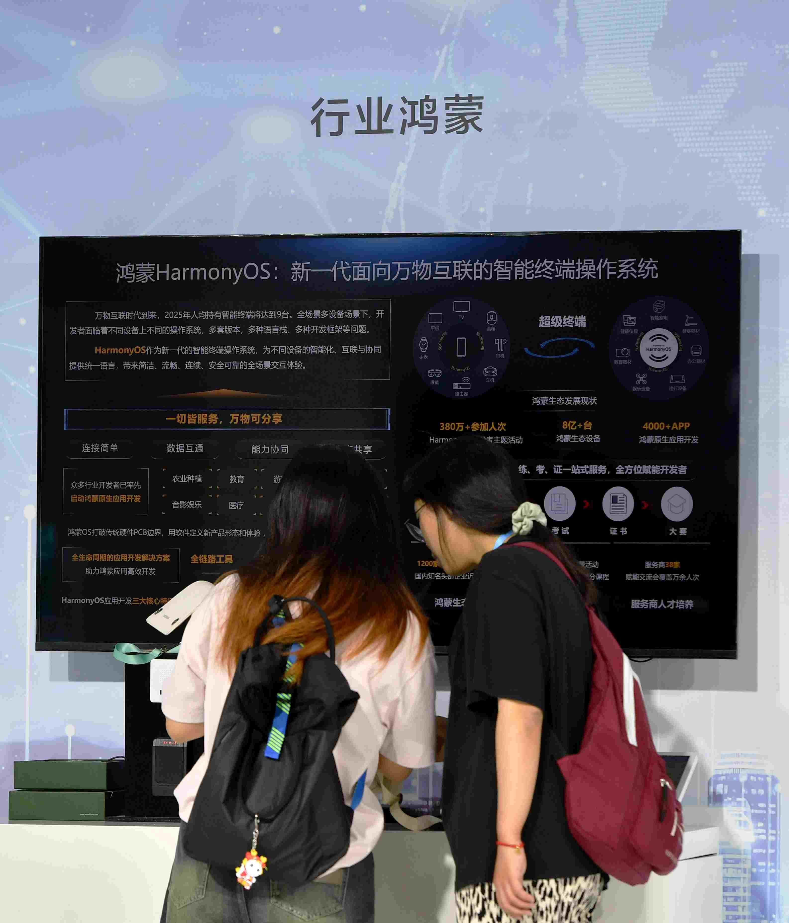 在現(xiàn)場(chǎng)體驗(yàn)區(qū),兩名觀眾在體驗(yàn)鴻蒙智能終端系統(tǒng)。新華社記者魏培全 攝