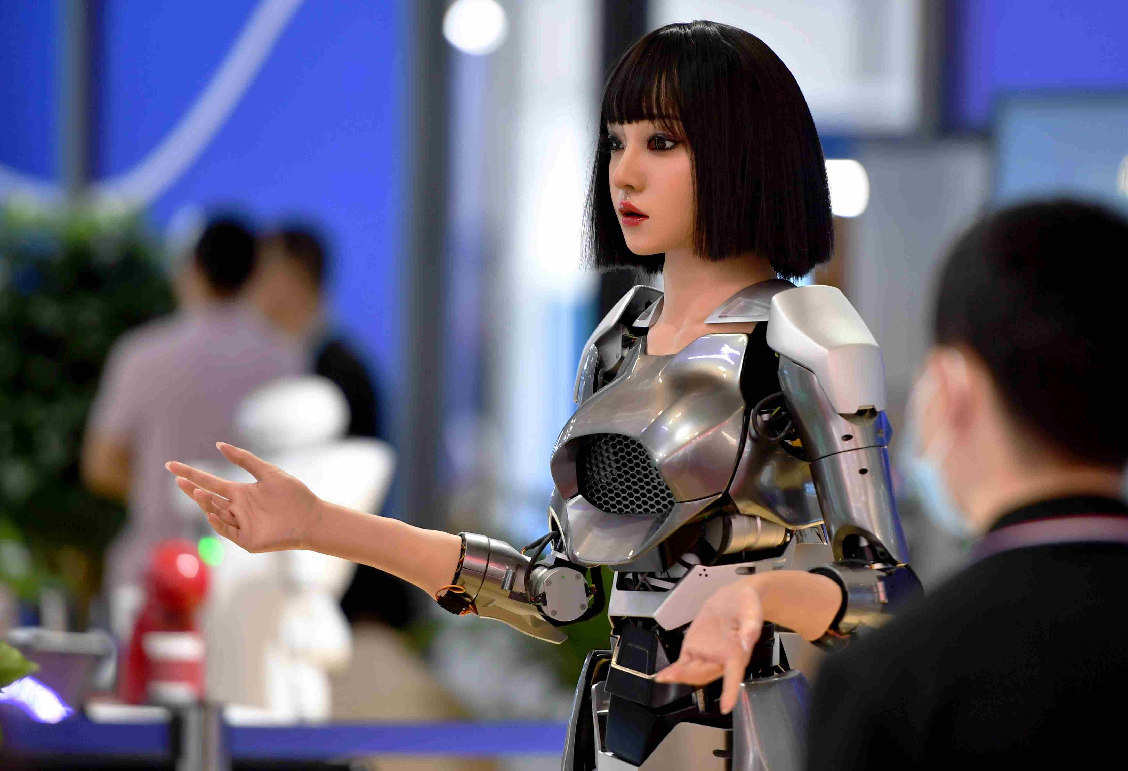 在現(xiàn)場(chǎng)體驗(yàn)區(qū),超仿生人形機(jī)器人“小柒”在向觀眾致意。 新華社記者魏培全 攝