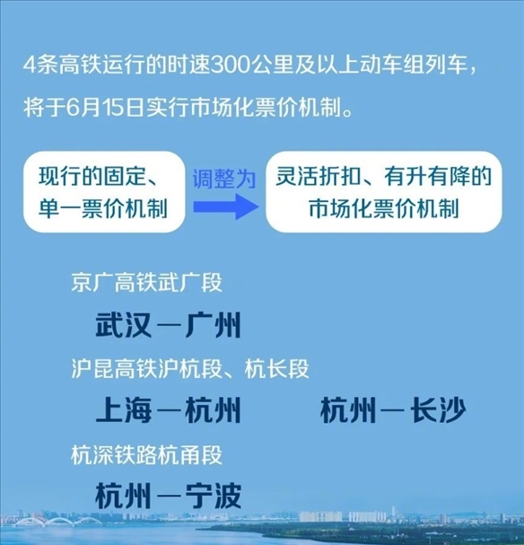 ·6月1日開售實行市場化票價機制的4條高鐵車票,最低55折。