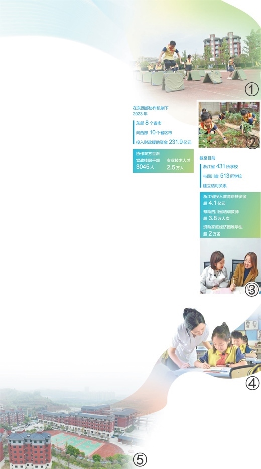圖①:孩子們在上體育課。人民網記者 王 波攝 圖②:孩子們在上勞動課。圖③:之江小學教師(右)在浙江交流學習。受訪者供圖 圖④:老師在為五年級一班的孩子輔導作業(yè)。圖⑤:之江小學校園。圖②④⑤均為本報記者宋豪新攝數(shù)據(jù)來源:農業(yè)農村部、浙江省教育廳、四川省教育廳